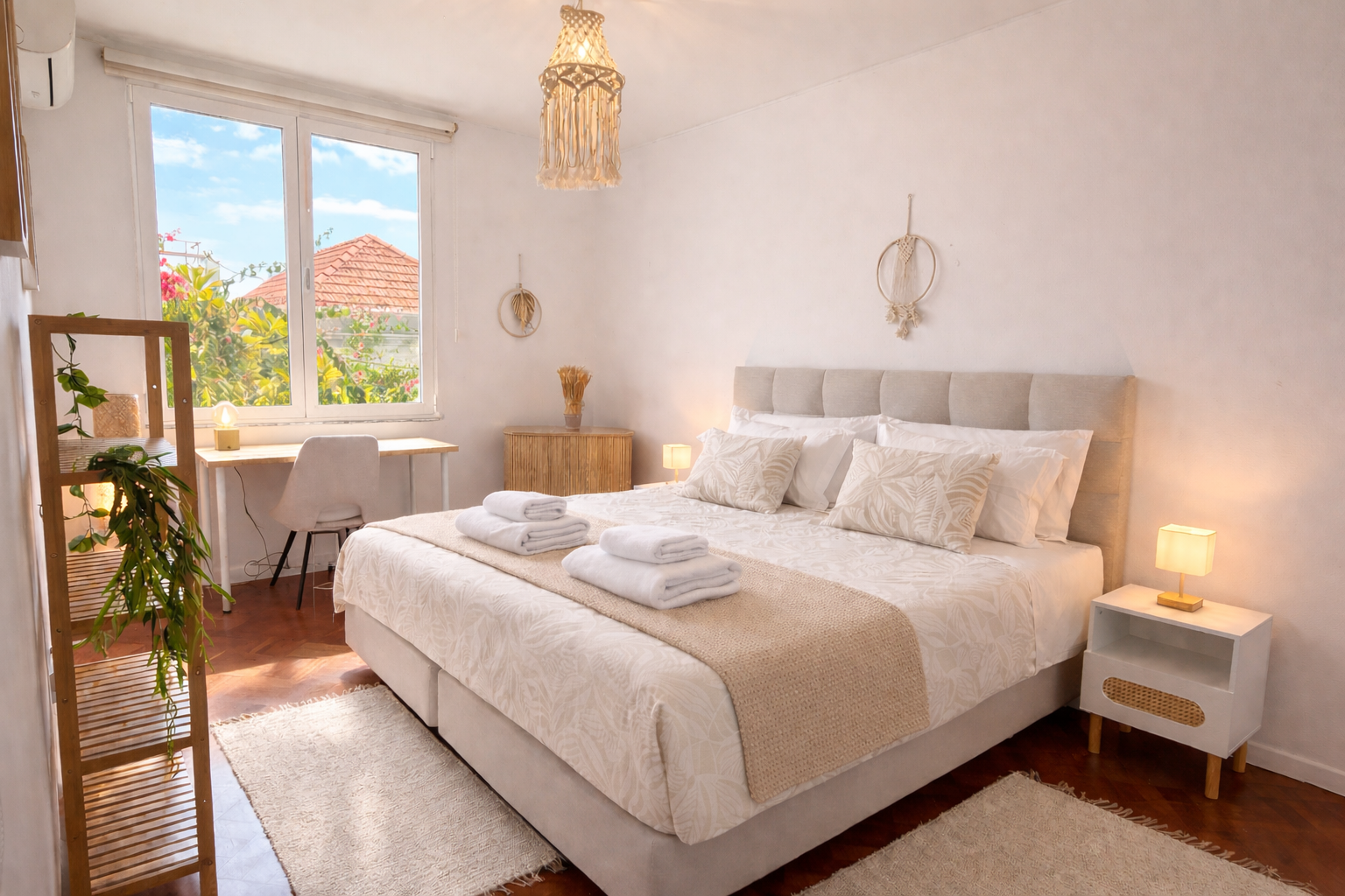Each room comes with AC, double-glazed windows, a dedicated work space (with desk, plugs, ergonomic chair and monitor), super fast Wi-Fi, large cabinets, night tables, and several lighting options
